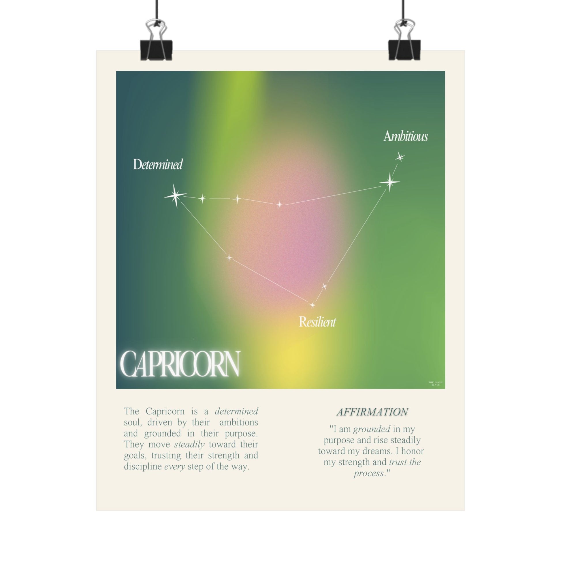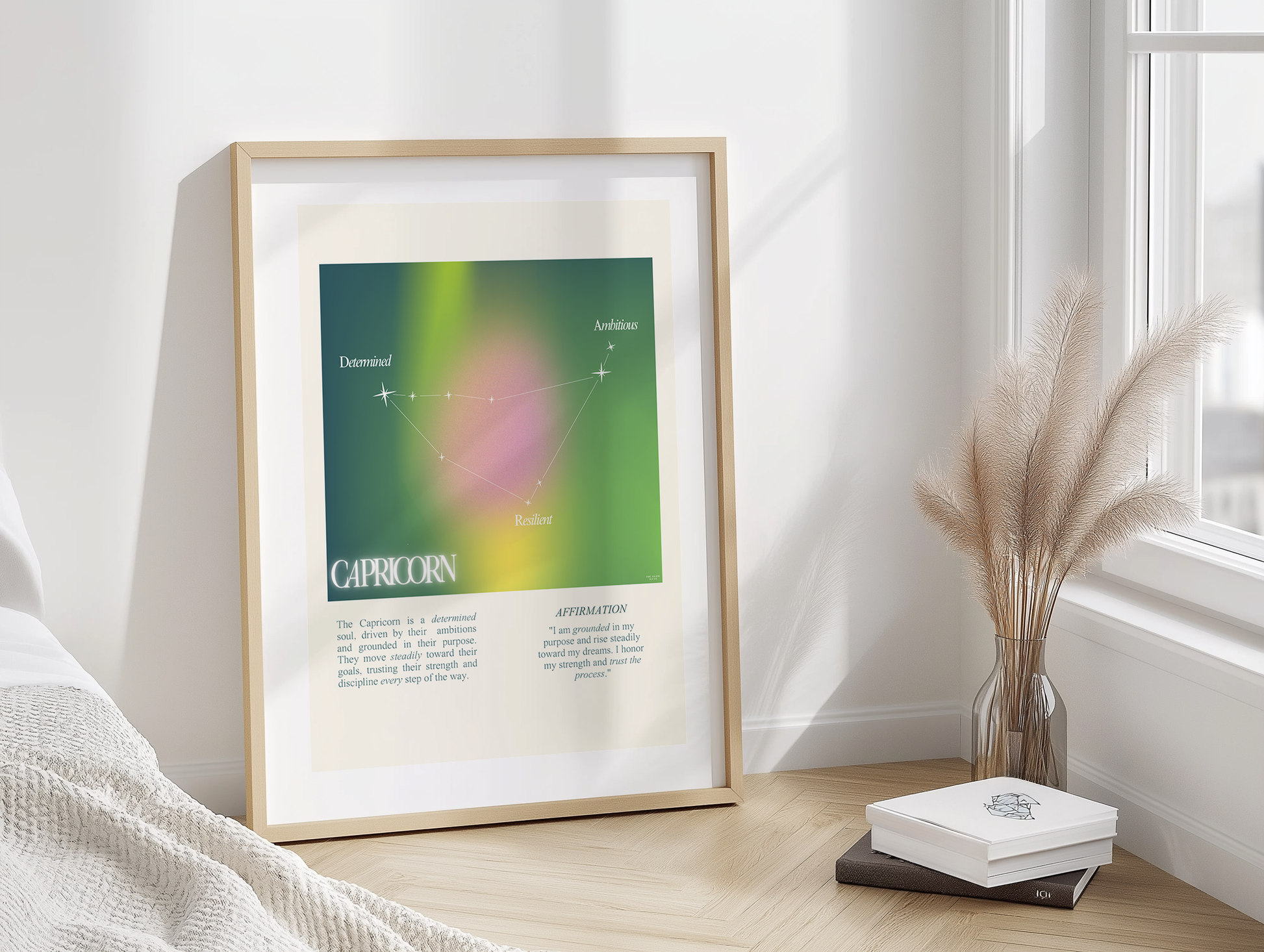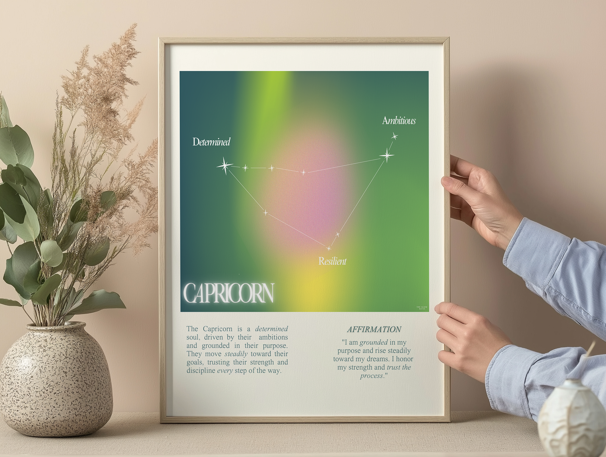 Capricorn star sign poster with auro color reflecting the sign, featuring a strong quote that aligns with the sign. Perfect for astrology enthusiasts looking to decorate their space with a personalized touch. Ideal for gifting during birthdays or when celebrating the Capricorn season.