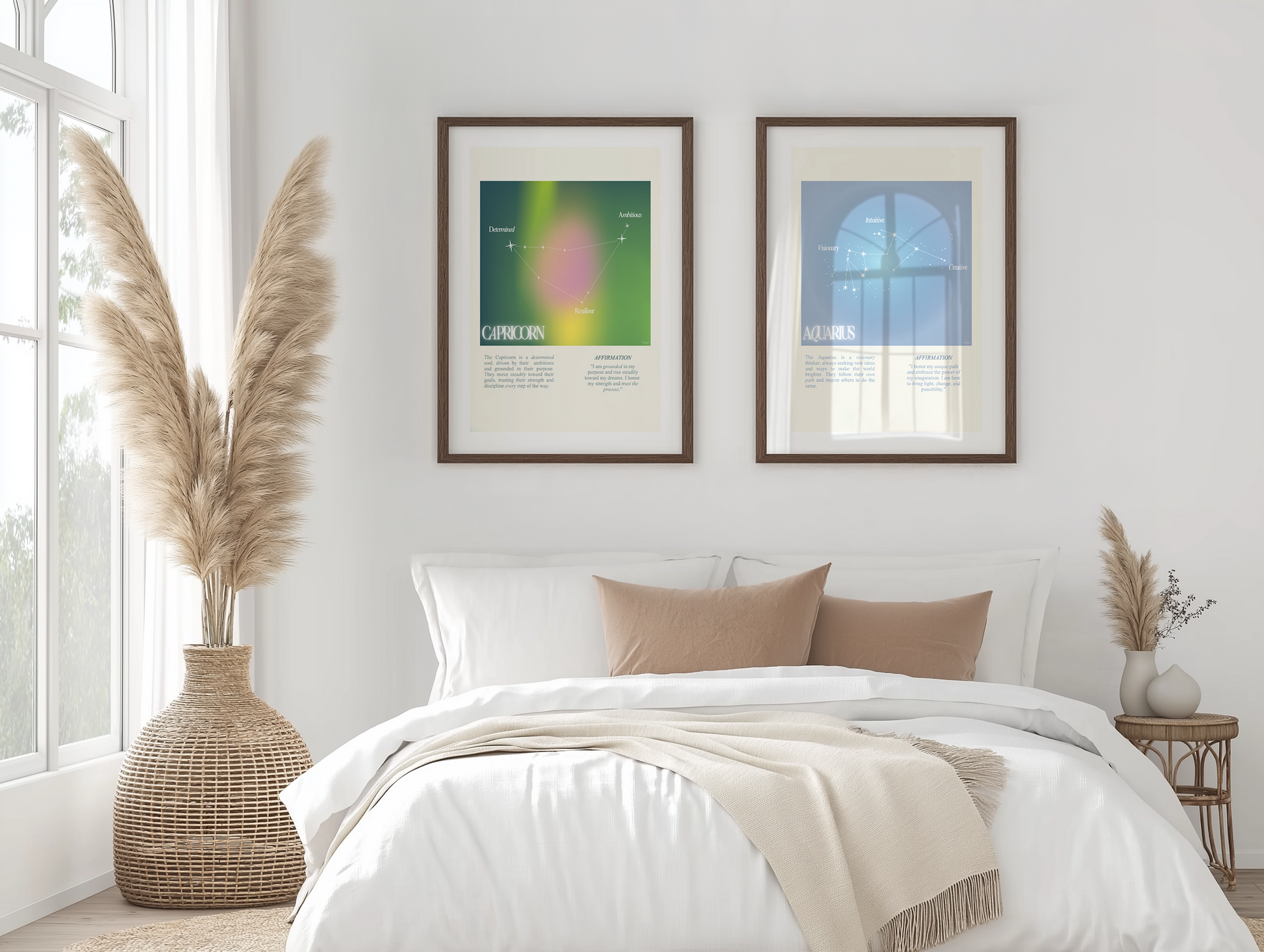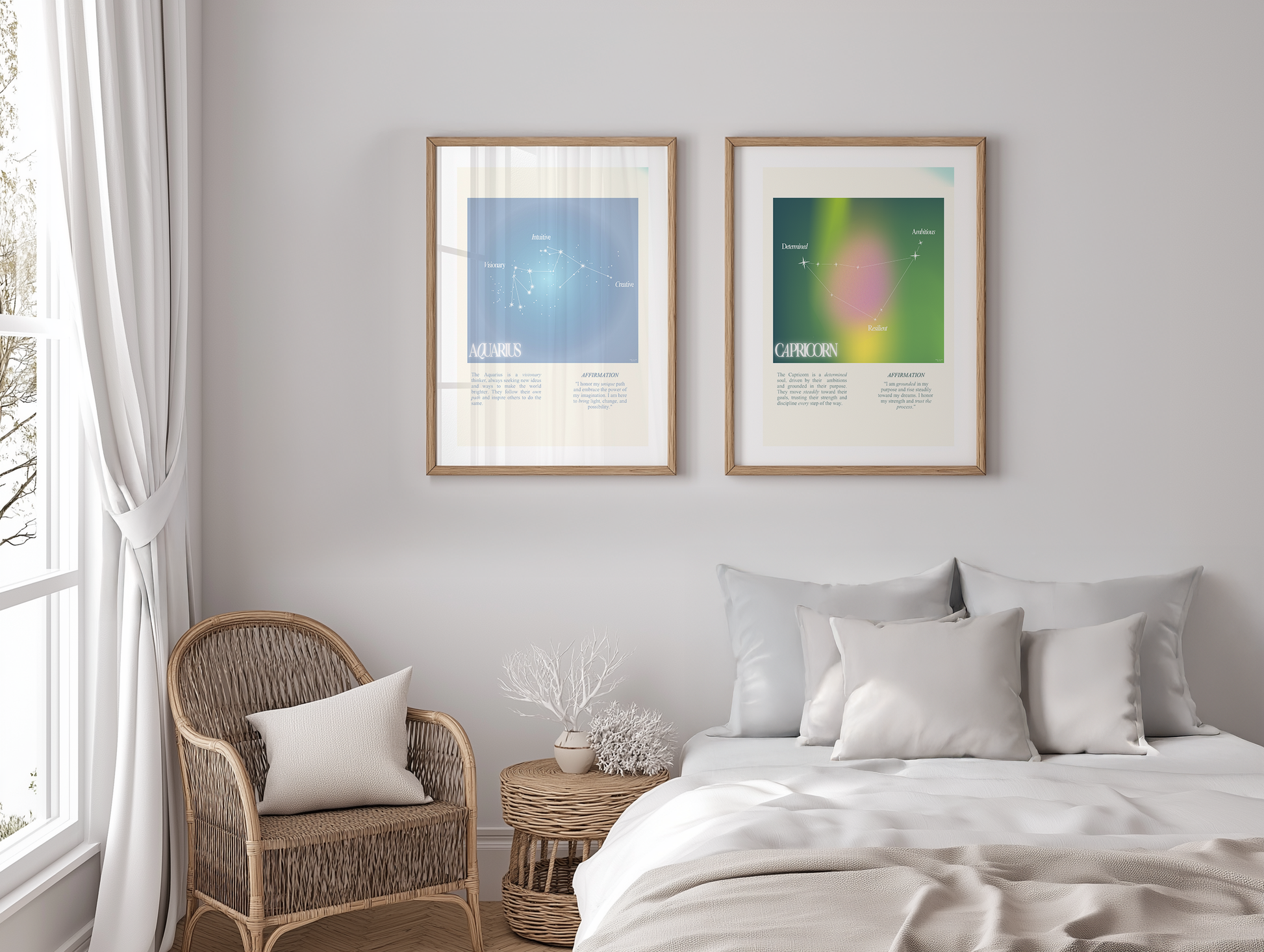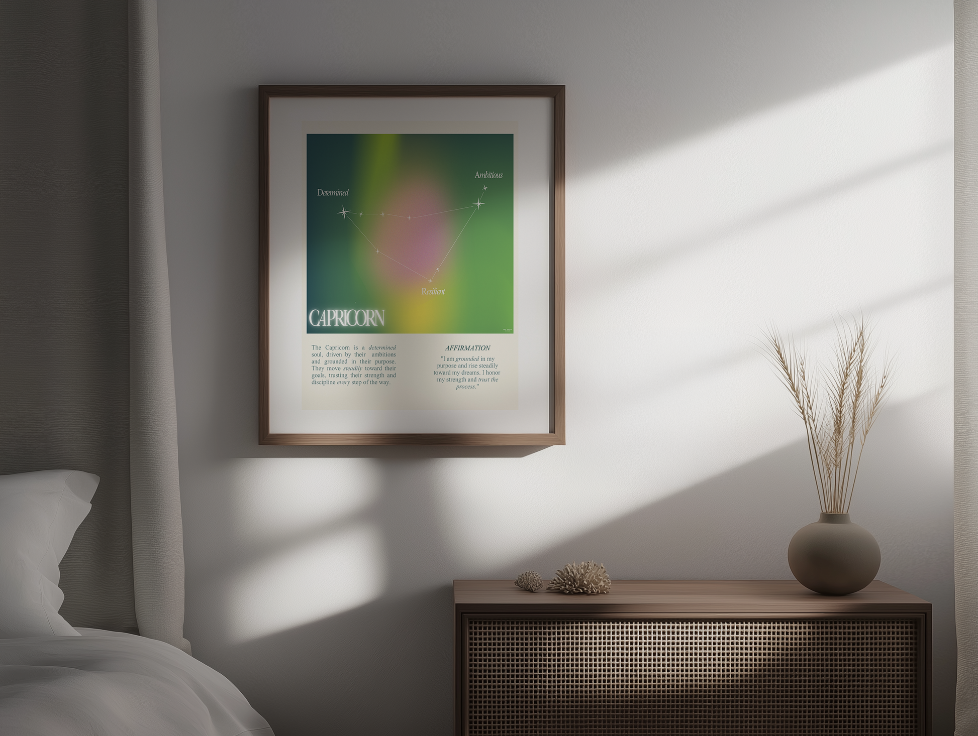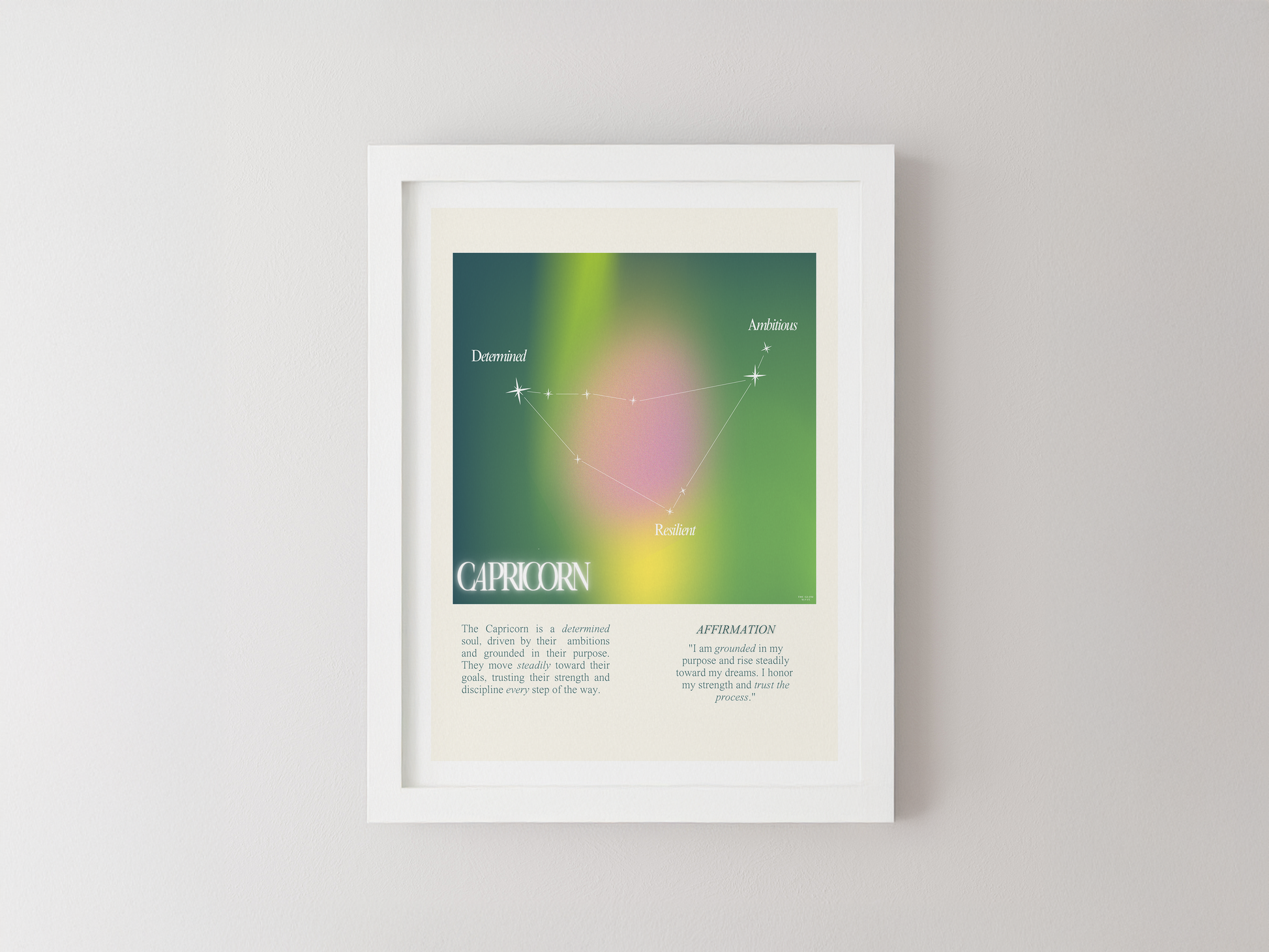Capricorn star sign poster with auro color reflecting the sign, featuring a strong quote that aligns with the sign. Perfect for astrology enthusiasts looking to decorate their space with a personalized touch. Ideal for gifting during birthdays or when celebrating the Capricorn season.