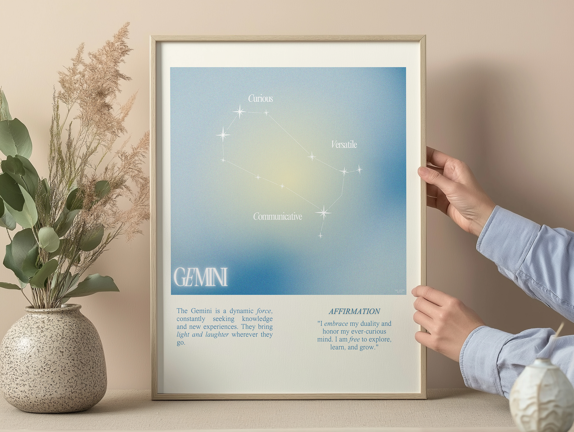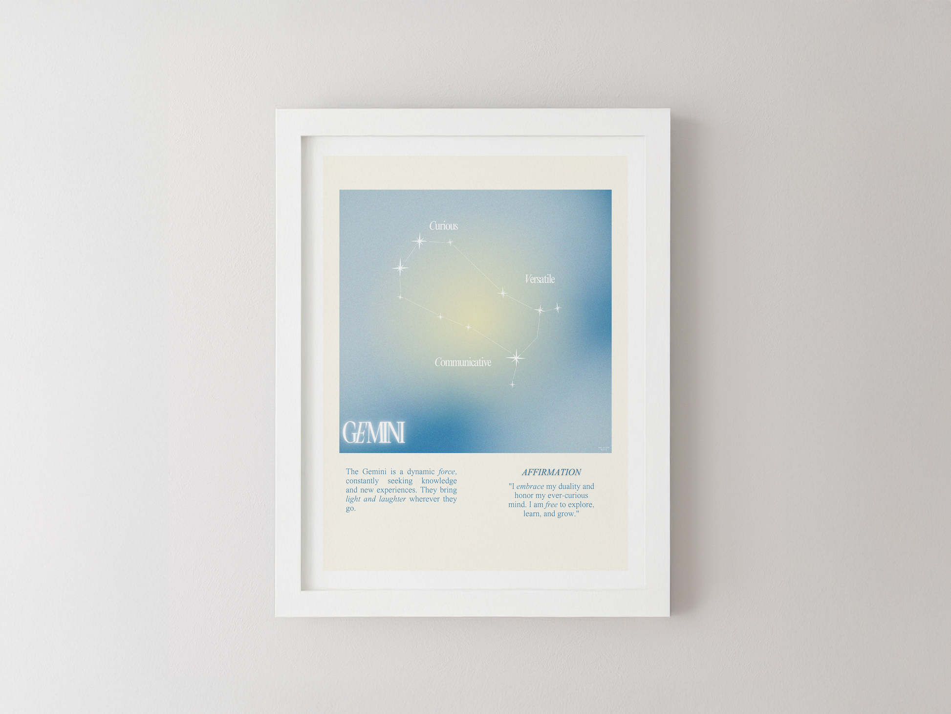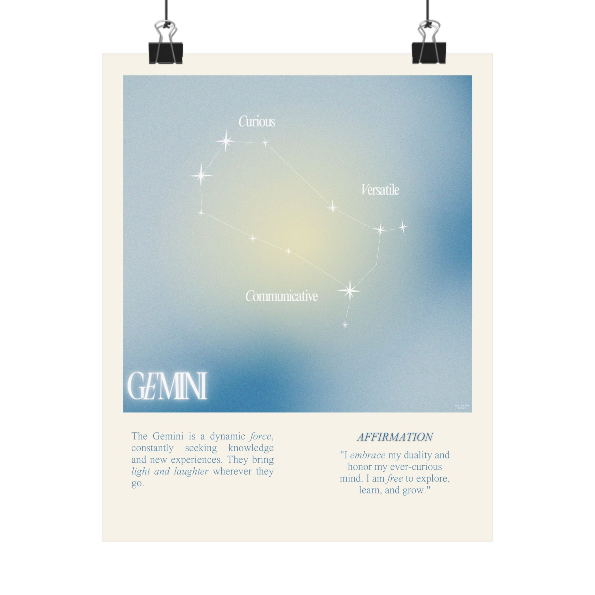 Gemini star sign poster with auro color reflecting the sign, featuring a strong quote that aligns with the sign. Perfect for astrology enthusiasts looking to decorate their space with a personalized touch. Ideal for gifting during birthdays or when celebrating the Gemini season.