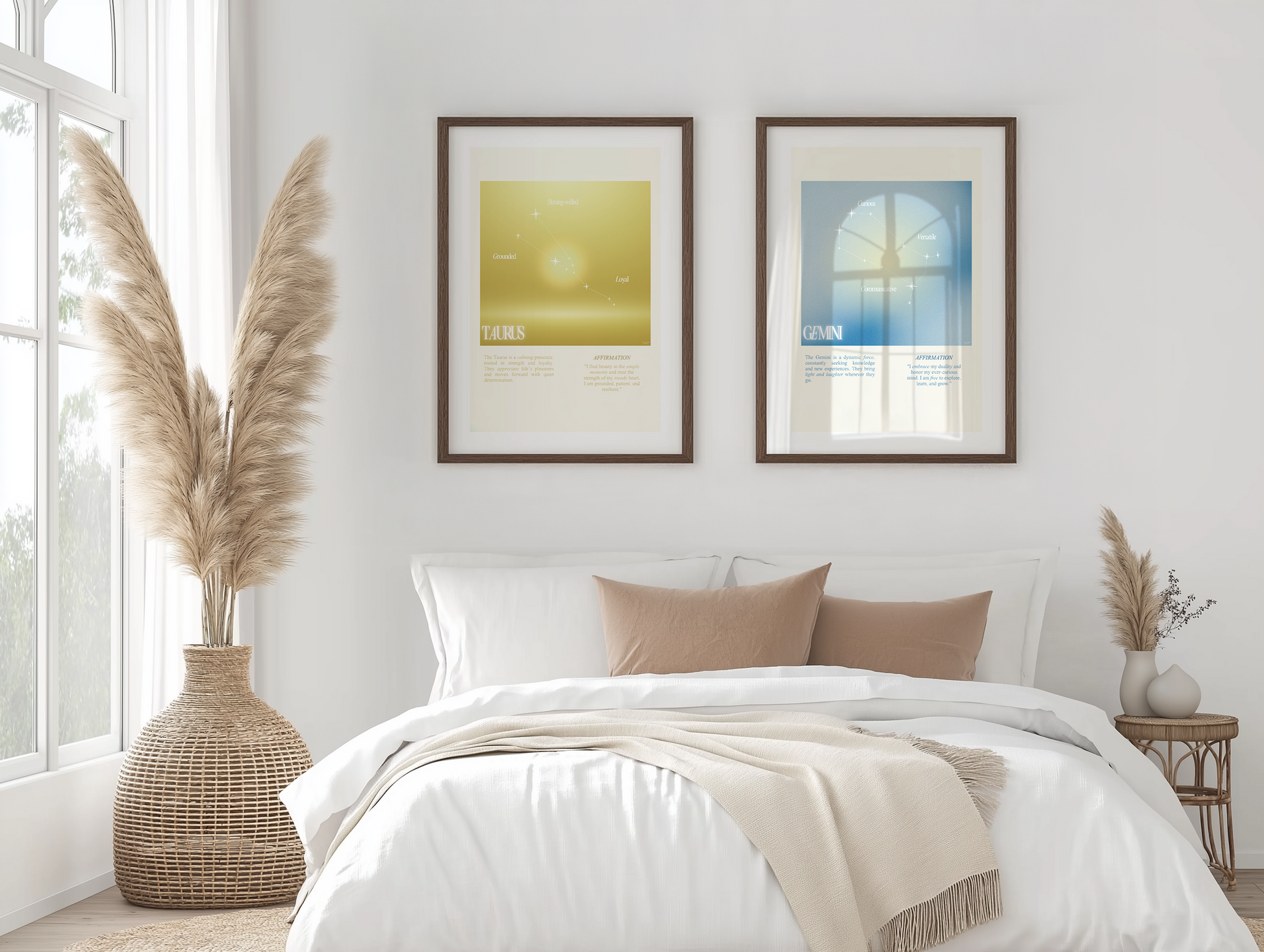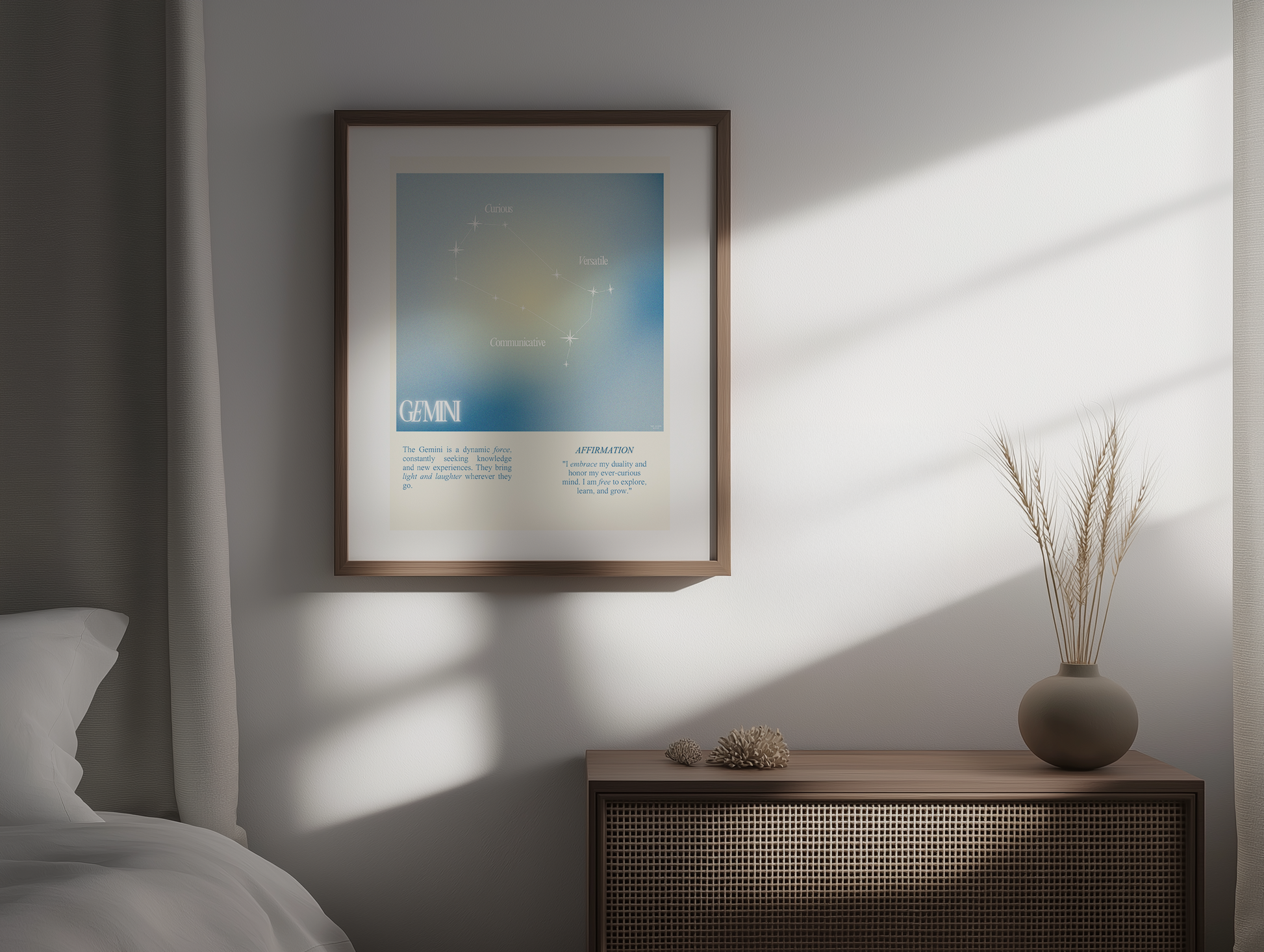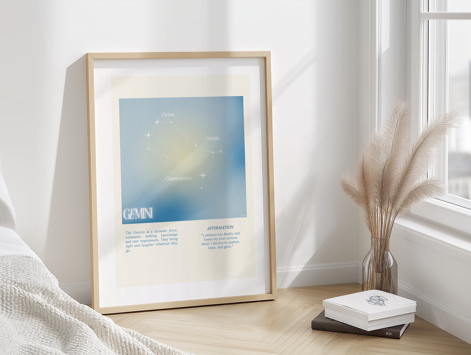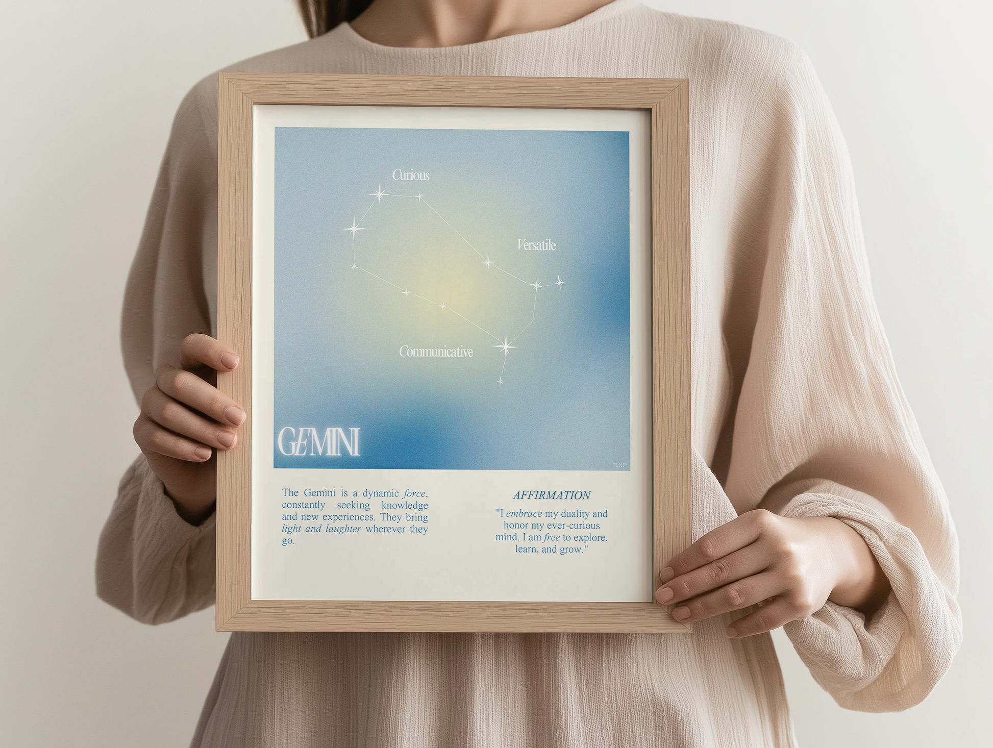 Gemini star sign poster with auro color reflecting the sign, featuring a strong quote that aligns with the sign. Perfect for astrology enthusiasts looking to decorate their space with a personalized touch. Ideal for gifting during birthdays or when celebrating the Gemini season.