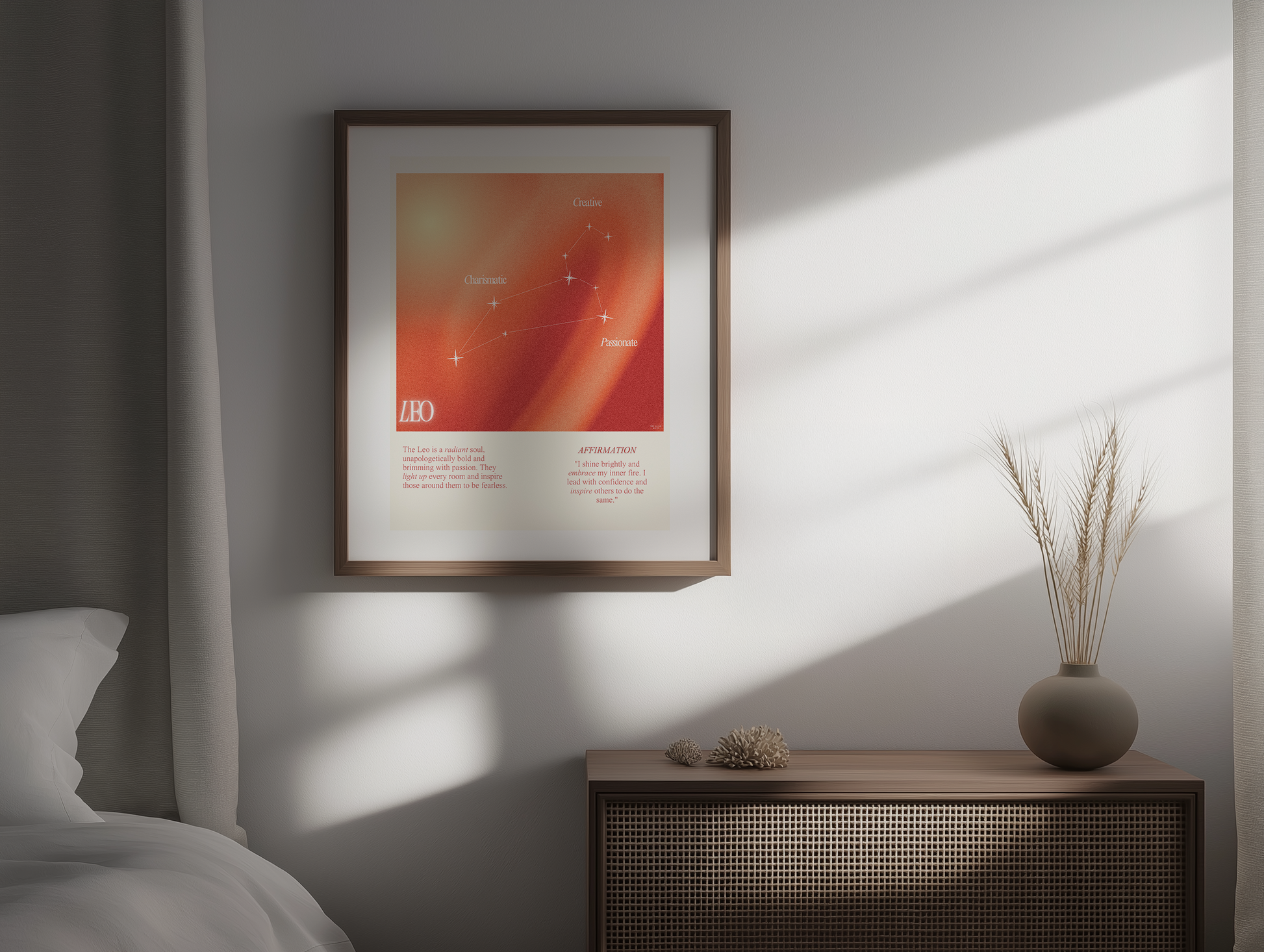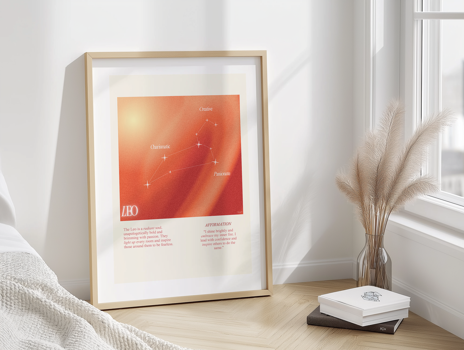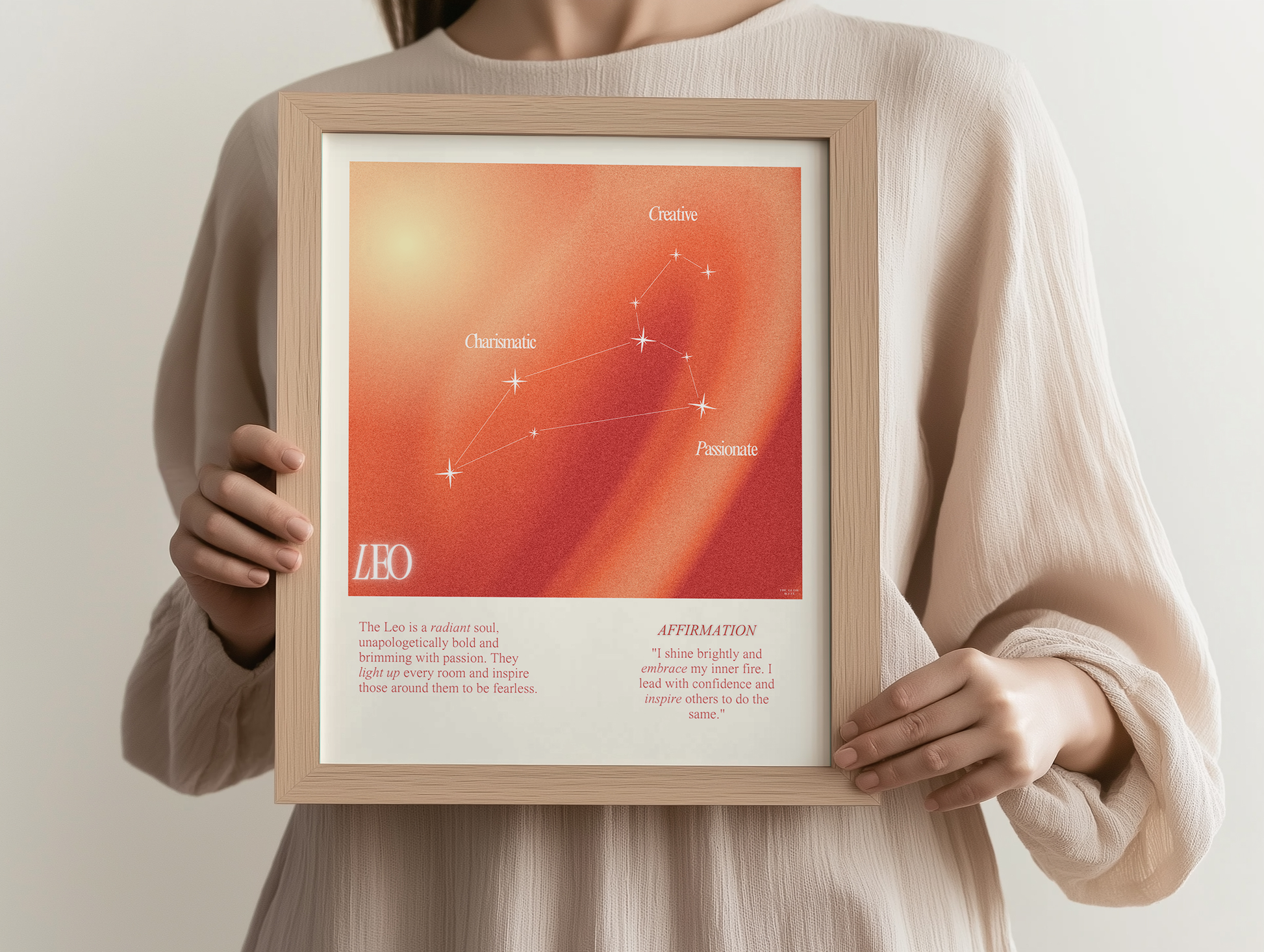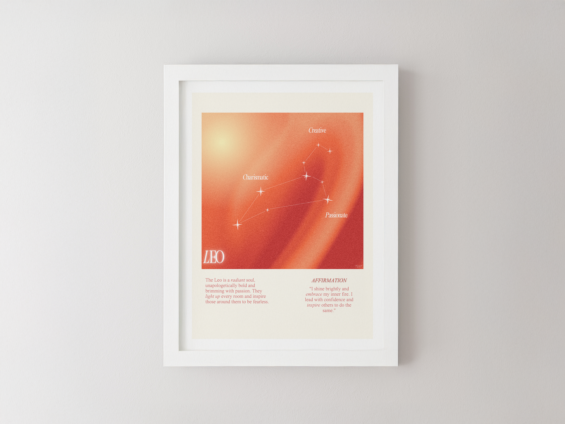 Leo star sign poster with auro color reflecting the sign, featuring a strong quote that aligns with the sign. Perfect for astrology enthusiasts looking to decorate their space with a personalized touch. Ideal for gifting during birthdays or when celebrating the Leo season.