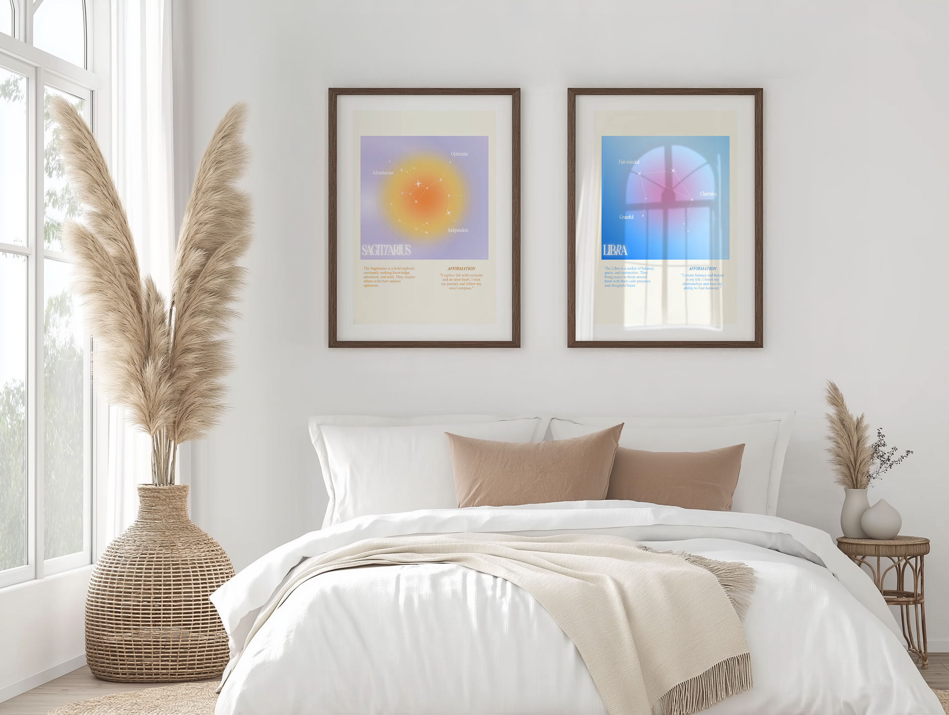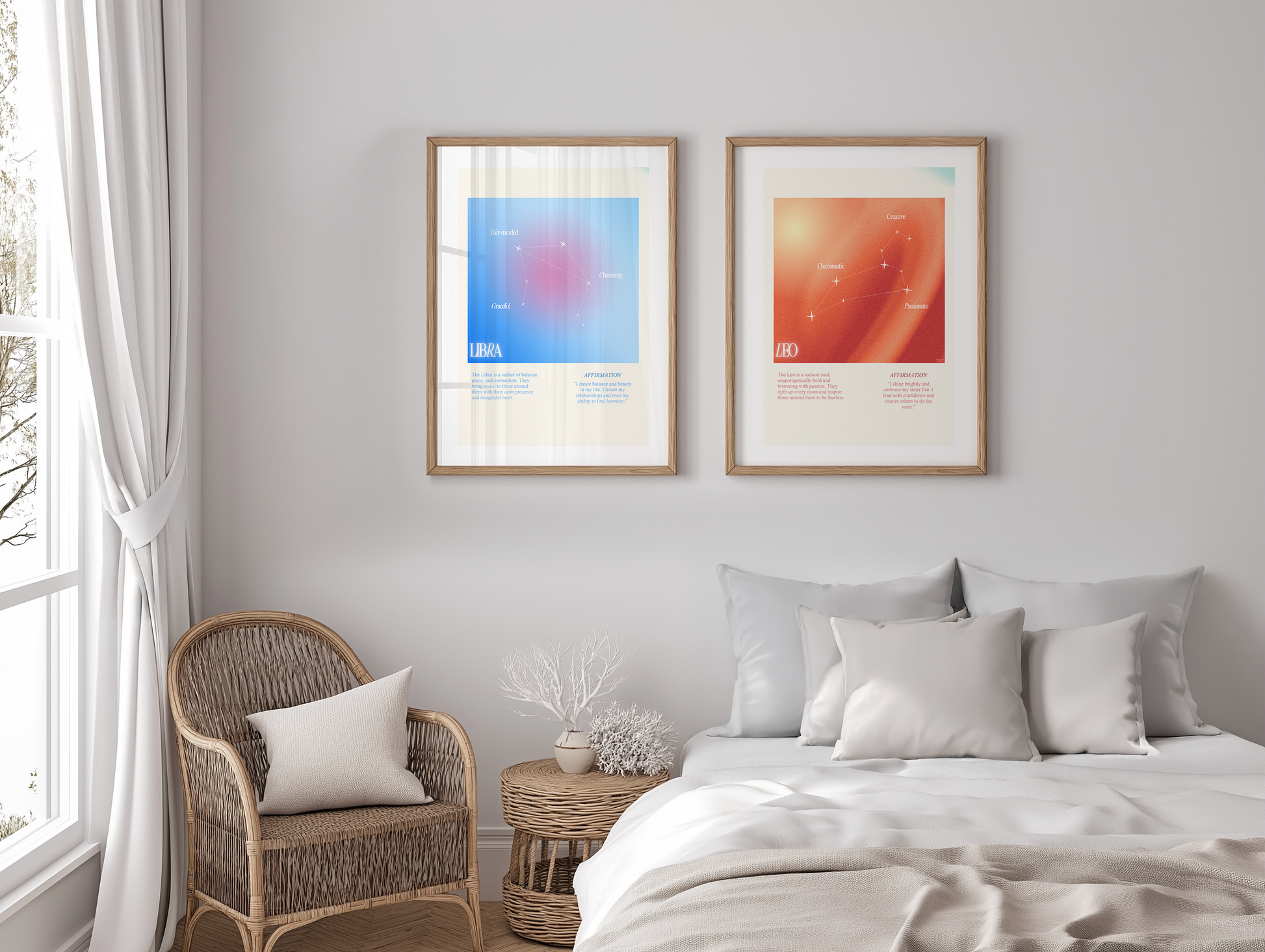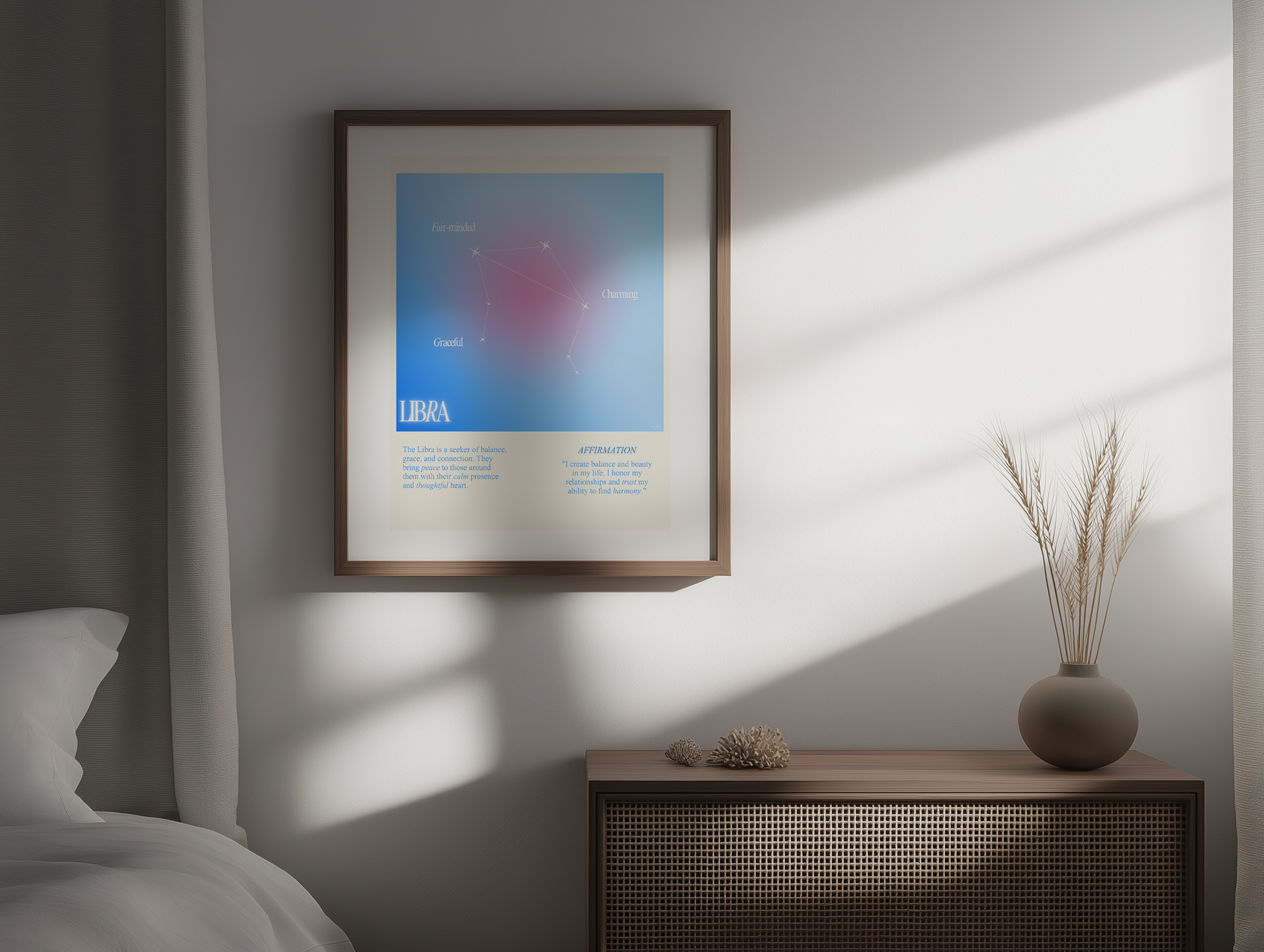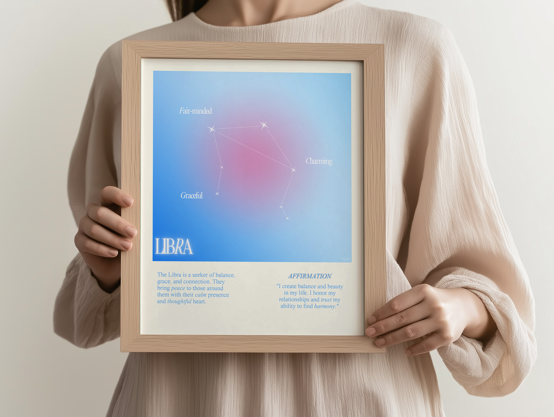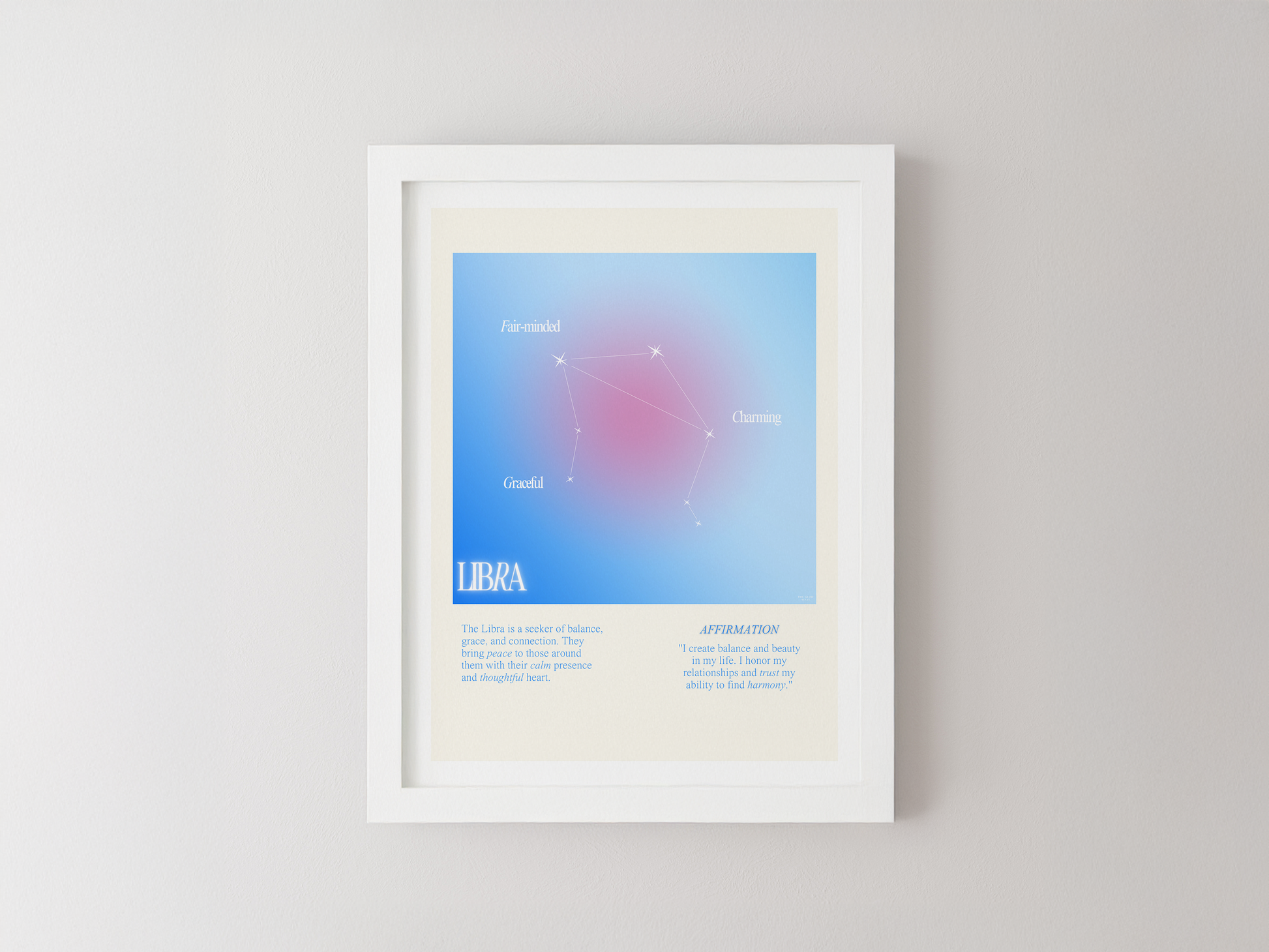Libra star sign poster with auro color reflecting the sign, featuring a strong quote that aligns with the sign. Perfect for astrology enthusiasts looking to decorate their space with a personalized touch. Ideal for gifting during birthdays or when celebrating the Libra season.