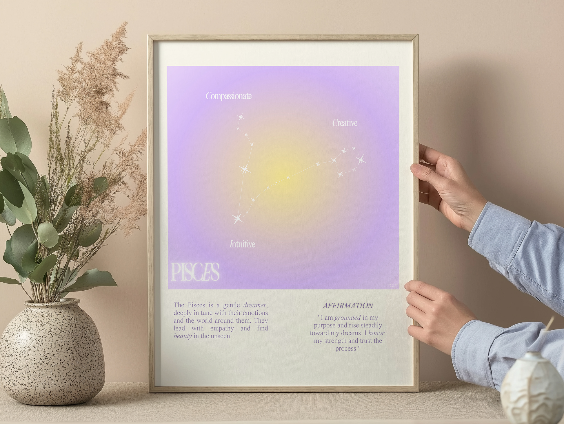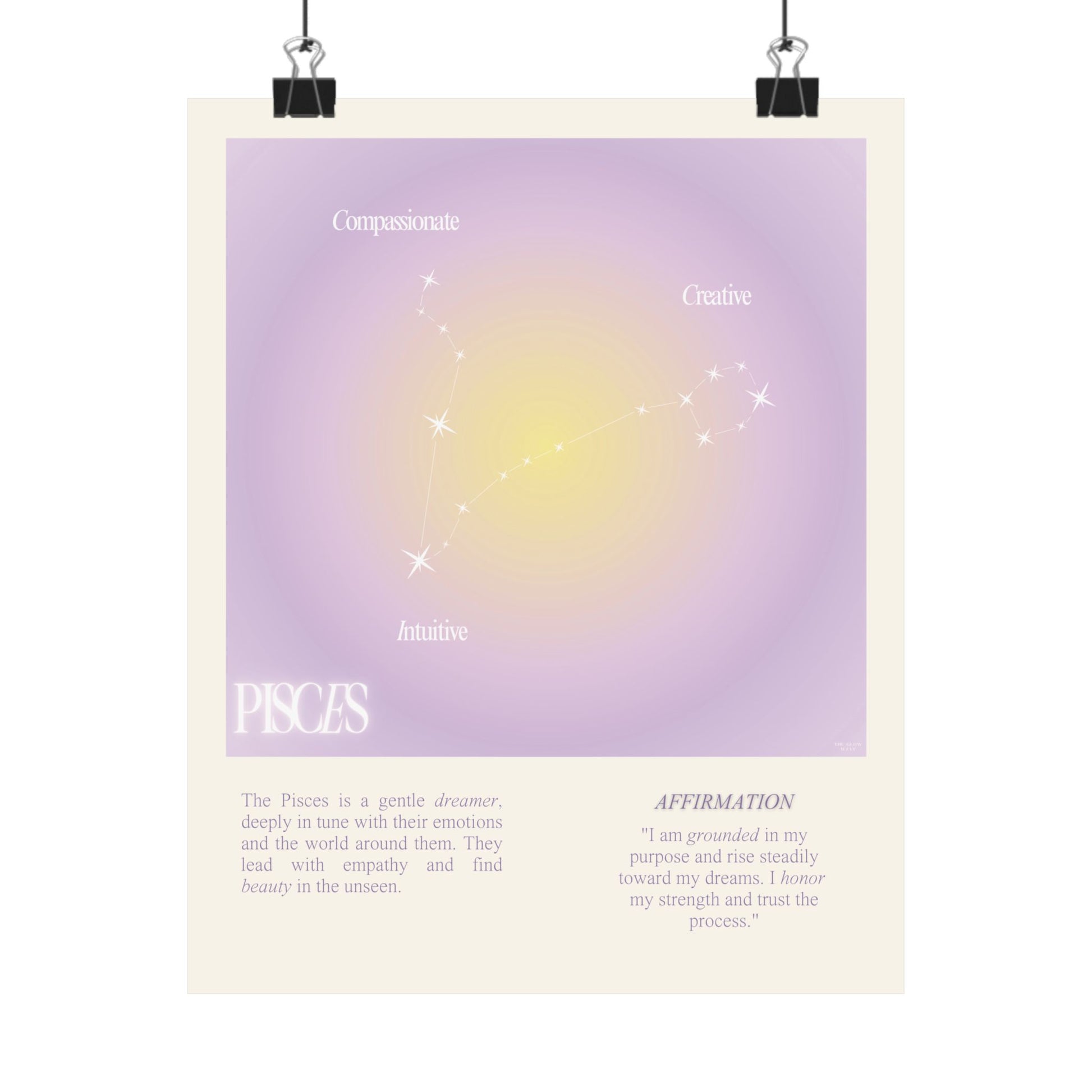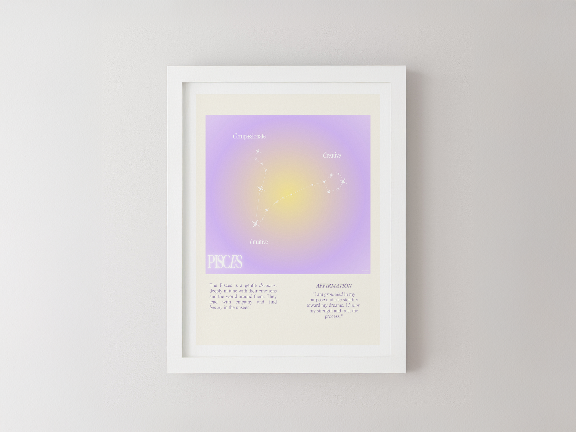 Pisces star sign poster with auro color reflecting the sign, featuring a strong quote that aligns with the sign. Perfect for astrology enthusiasts looking to decorate their space with a personalized touch. Ideal for gifting during birthdays or when celebrating the Pisces season.