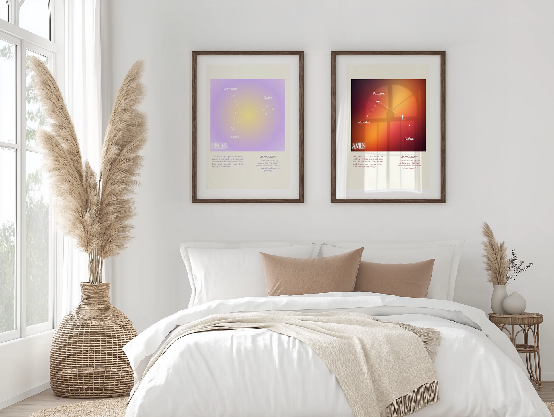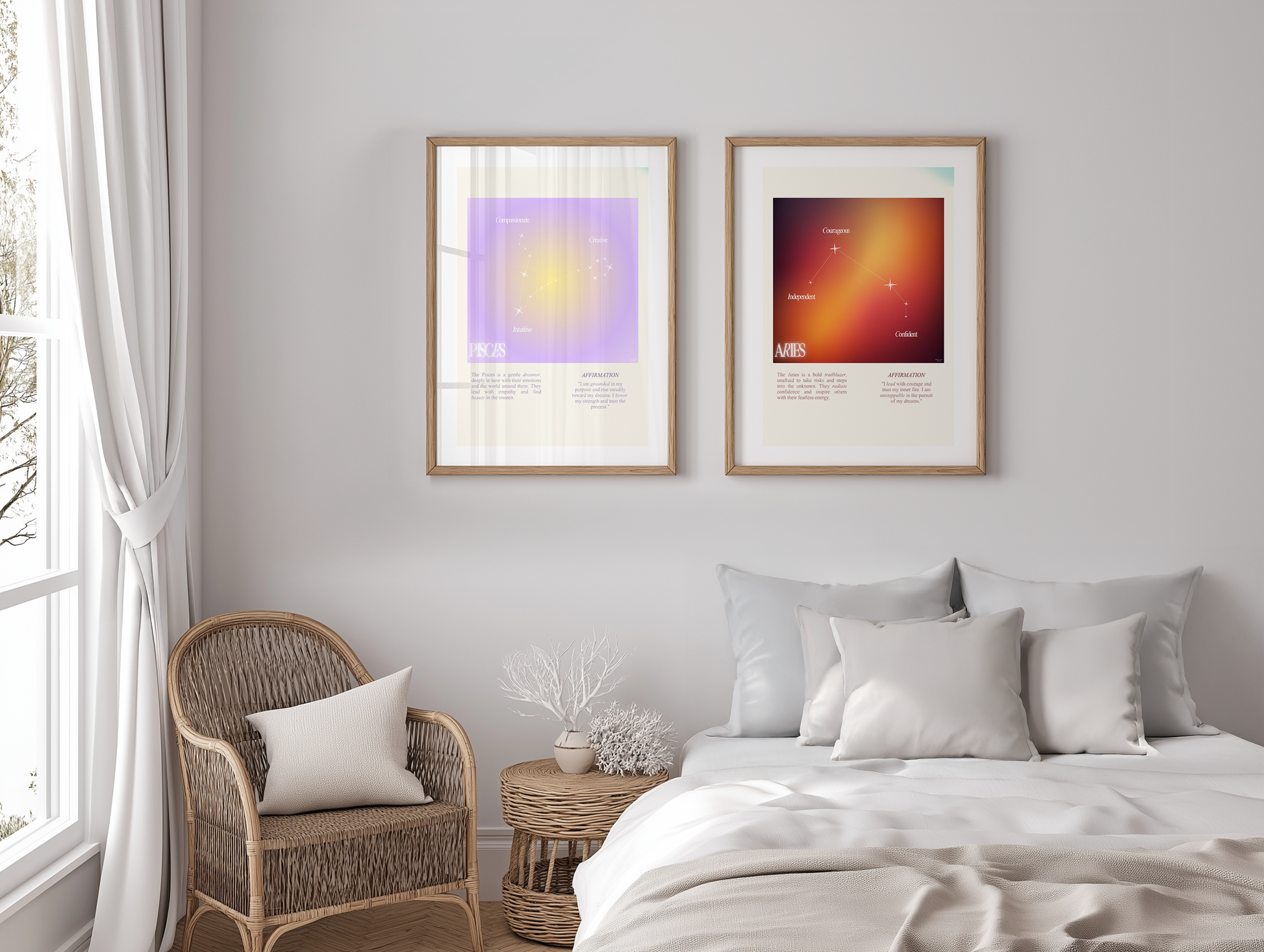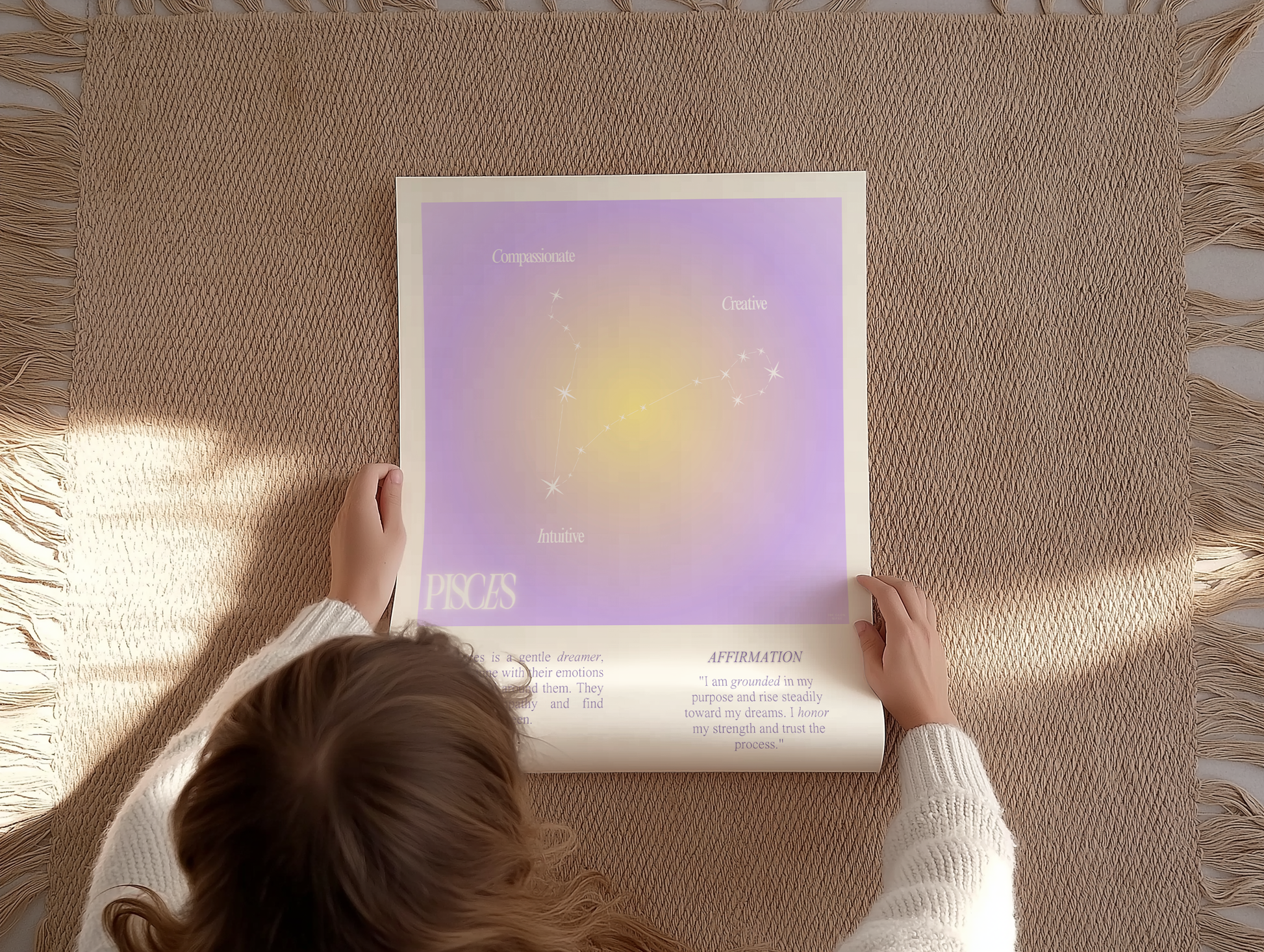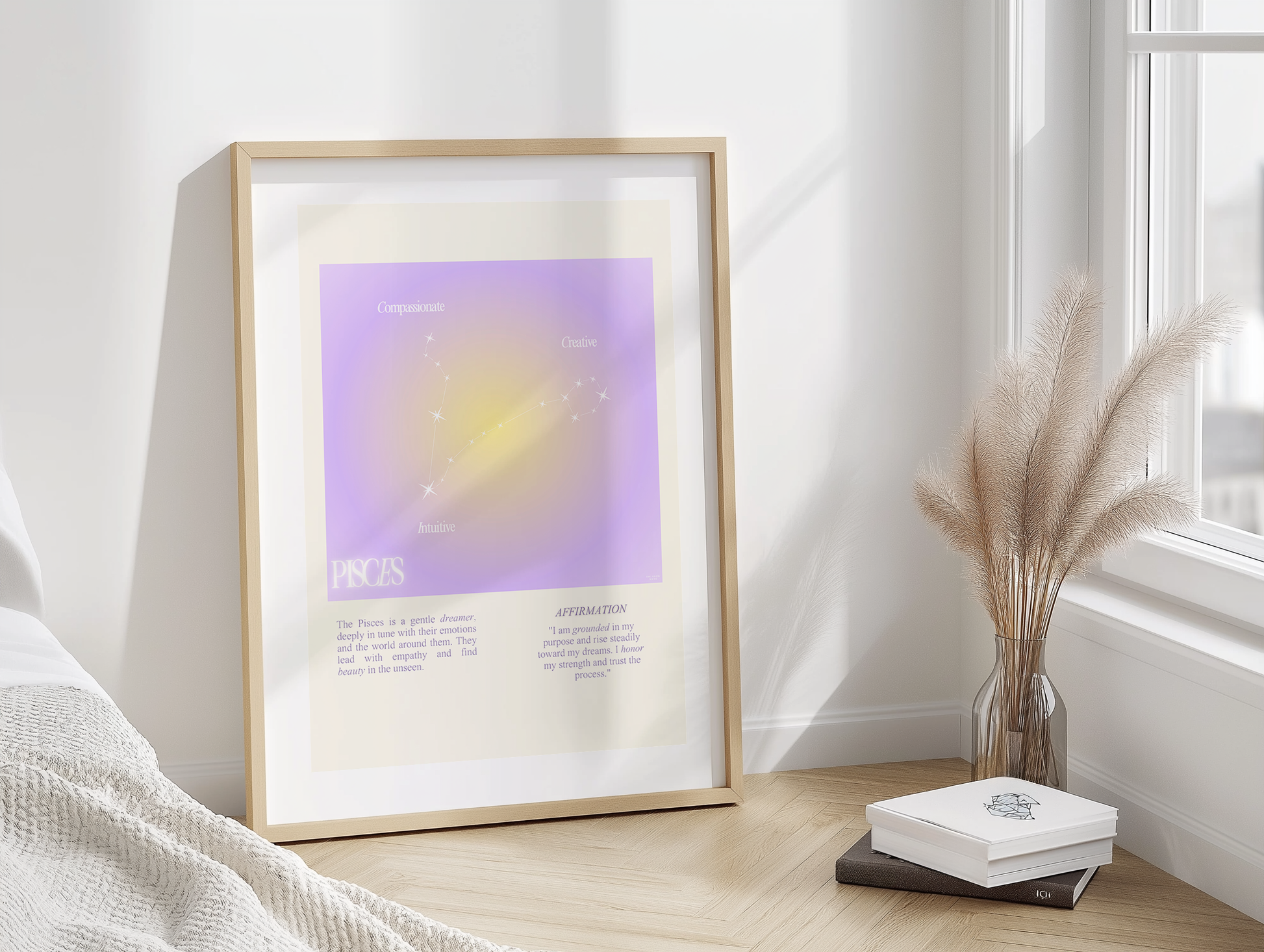 Pisces star sign poster with auro color reflecting the sign, featuring a strong quote that aligns with the sign. Perfect for astrology enthusiasts looking to decorate their space with a personalized touch. Ideal for gifting during birthdays or when celebrating the Pisces season.