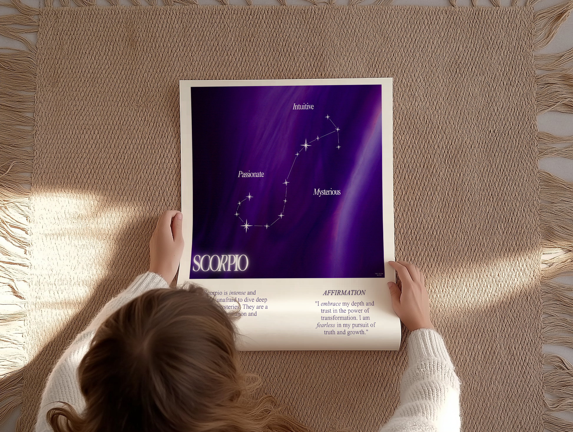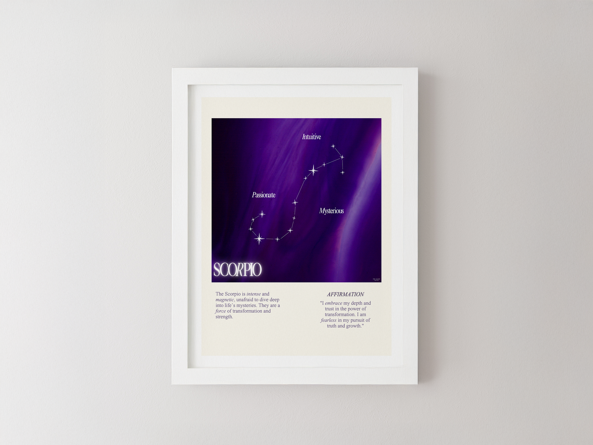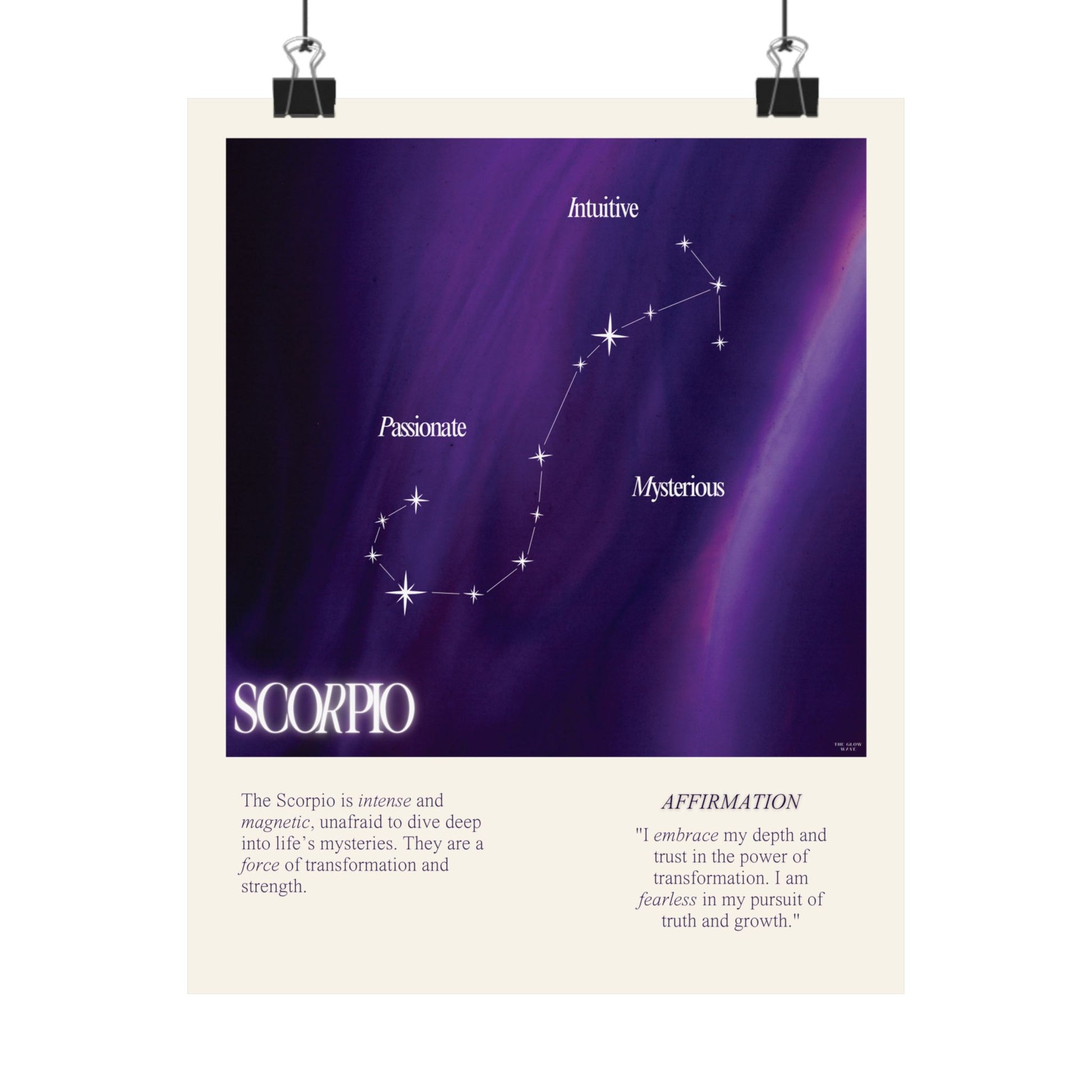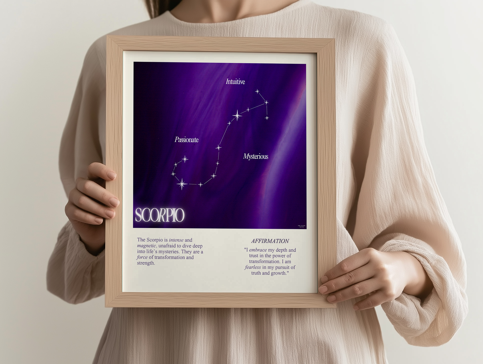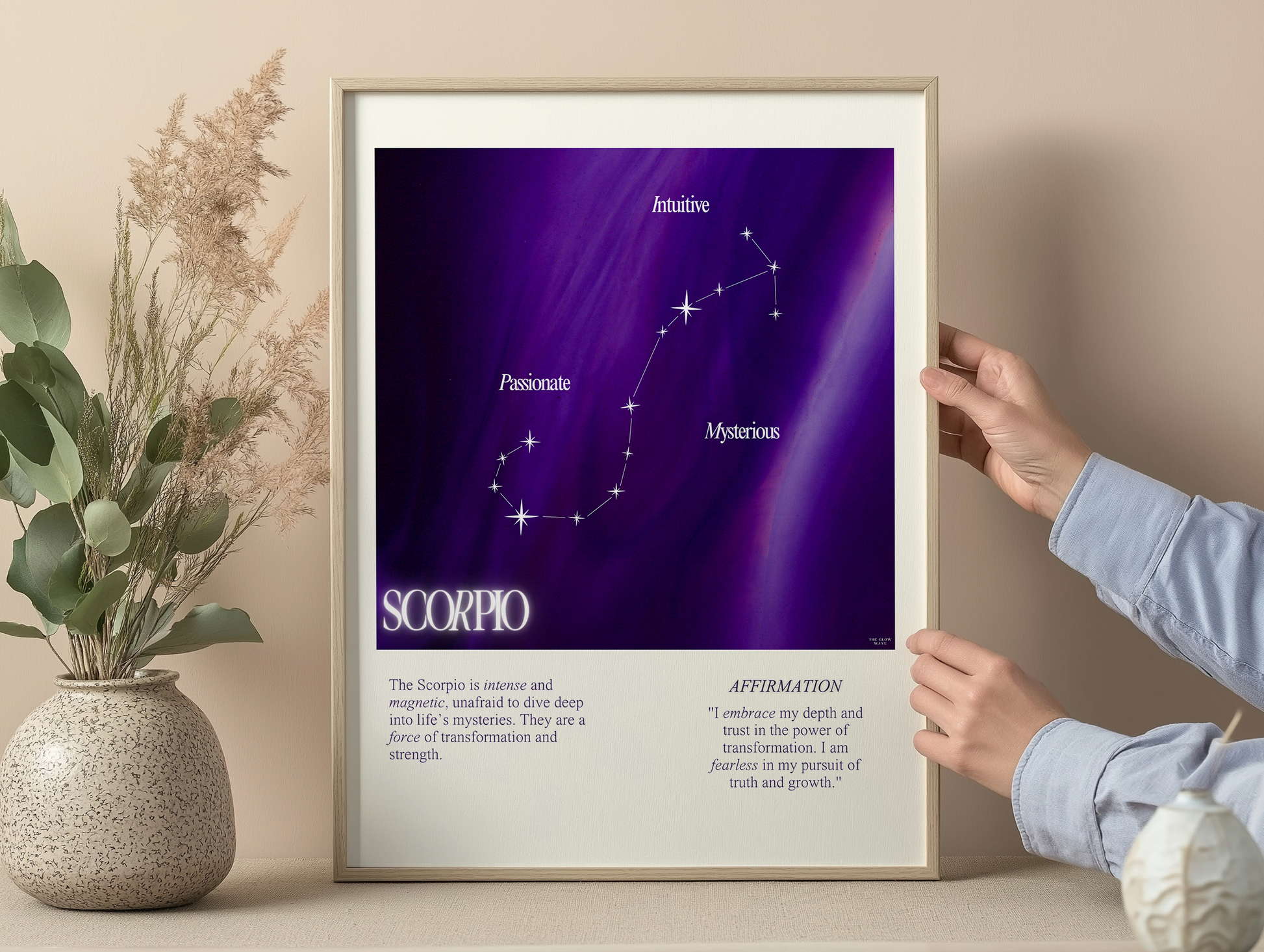 Scorpio star sign poster with auro color reflecting the sign, featuring a strong quote that aligns with the sign. Perfect for astrology enthusiasts looking to decorate their space with a personalized touch. Ideal for gifting during birthdays or when celebrating the Scorpio season.